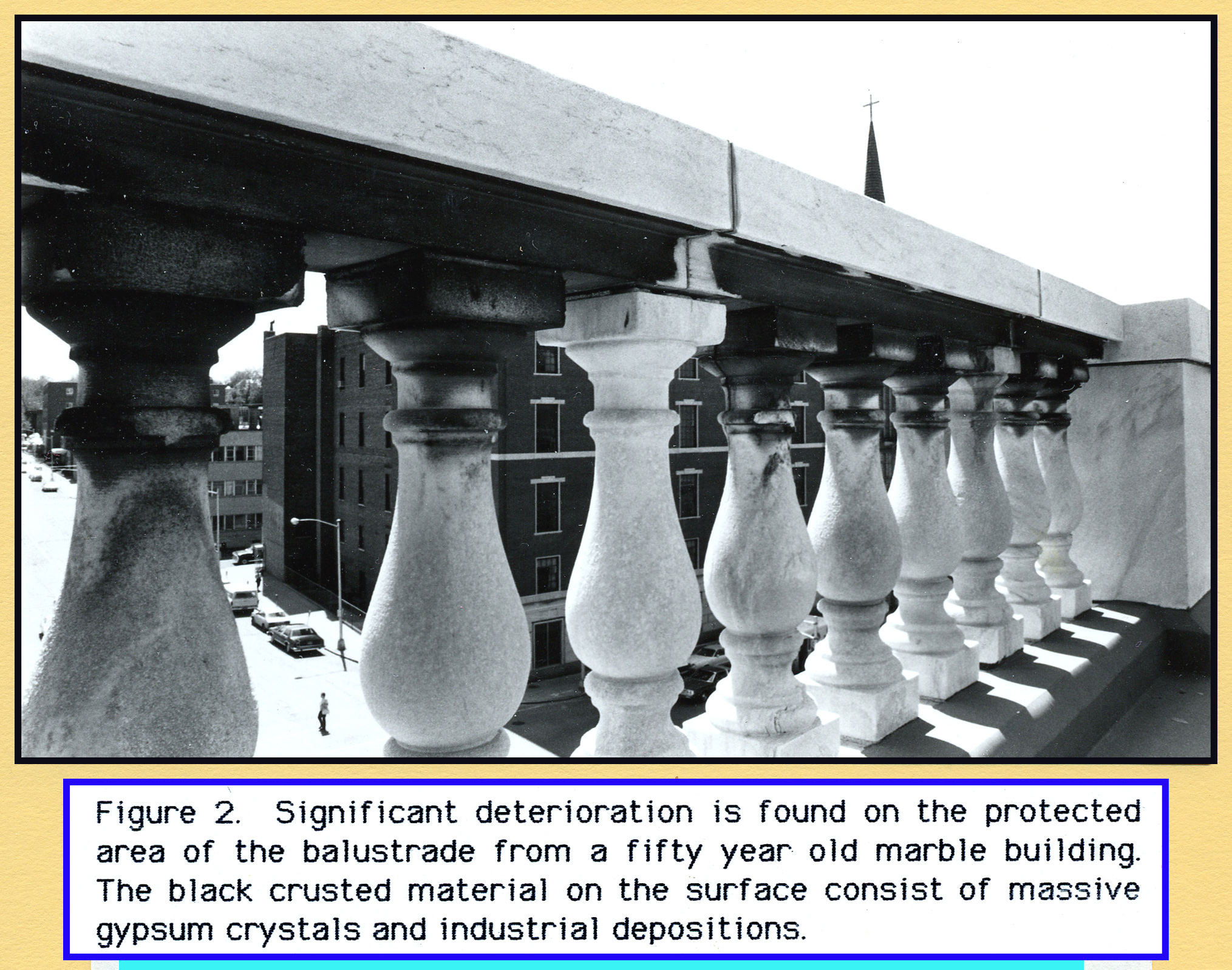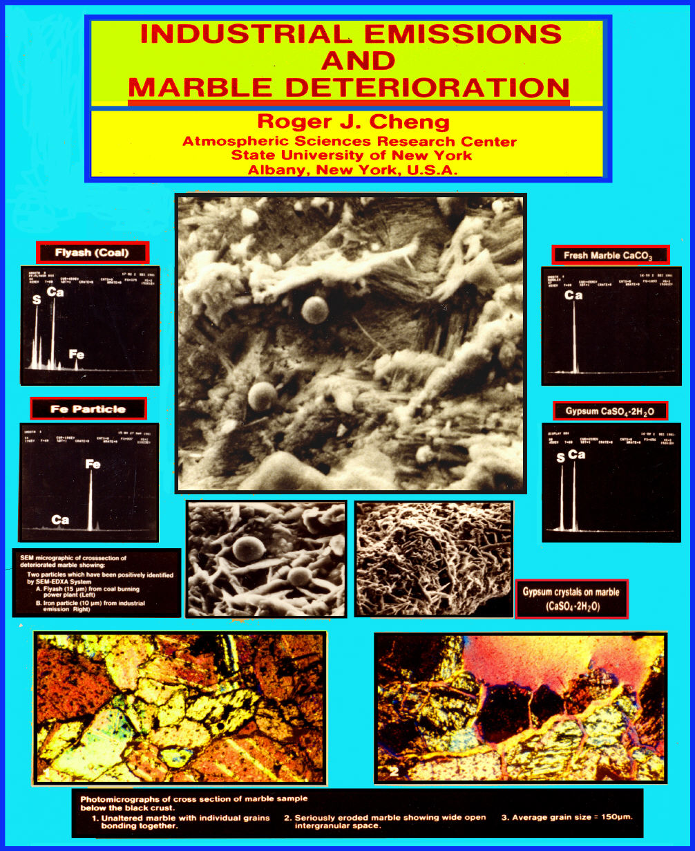 Microscopical investigation reveals that industrial emissions play a major role in the deterioration of marble structures and historic monuments (References 1, 2).  Chemical analysis indicates that the serious damage is primarily due to a constant direct attack by sulfuric acid (H/2SO/4). Industrial particulate is always observed on the damaged surfaces.
